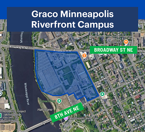 This year's site is the Graco Minneapolis Riverfront Campus in NE Minneapolis. For the competition, teams should assume that the building will be 100% vacant at the time of acquisition and may choose to reuse the existing building improvements or choose to demolish the building and start with a vacant site.